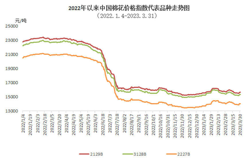 3月,國內(nèi)棉花現(xiàn)貨市場(chǎng)受期貨影響,月初緩慢上漲,中下旬持續(xù)下跌。月內(nèi)棉企積極促銷皮棉,中低等級(jí)資源讓利較多,高等級(jí)優(yōu)質(zhì)資源價(jià)格相對(duì)堅(jiān)挺,月中隨著棉價(jià)下跌,部分企業(yè)存在惜售心理,銷售積極性不佳,而部分急于出貨的企業(yè)點(diǎn)價(jià)成交量略增。月內(nèi)紡織廠新增訂單穩(wěn)中有增,月初多數(shù)紡織廠對(duì)下游有較高預(yù)期,積極補(bǔ)庫皮棉原料,但月中隨著棉價(jià)下跌、新增訂單有轉(zhuǎn)弱跡象及對(duì)后市不確定性避險(xiǎn)心理影響,皮棉采購維持隨用隨買。月末,中國棉花價(jià)格指數(shù)(CCIndex3128B)15347元/噸,環(huán)比下跌43元;月均價(jià)15396元/噸,環(huán)比下跌316元,同比下跌7352元。
