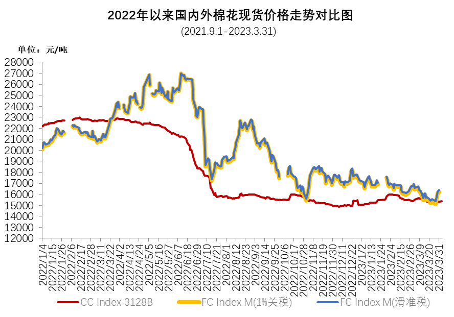 3月受美國硅谷銀行倒閉引發(fā)銀行業(yè)危機(jī)、全球商品市場(chǎng)震蕩下行、全球需求疲弱等因素影響,國際棉價(jià)震蕩下跌。3月ICE期棉主力合約月均結(jié)算價(jià)80.92美分/磅,環(huán)比下跌3.17美分,跌幅3.8%;中國進(jìn)口棉價(jià)格指數(shù)FCIndexM月均94.88美分/磅,環(huán)比下跌4.33美分;月底96.9美分/磅,環(huán)比下跌2.82美分,1%關(guān)稅下折人民幣16235元/噸,高于同期國內(nèi)現(xiàn)貨888元,內(nèi)外棉價(jià)價(jià)差較上月收窄284元左右。
