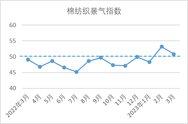 說明:中國棉紡織行業(yè)景氣指數(shù)采集自全國近500家次棉紡織企業(yè),參考國家制造業(yè)PMI等指數(shù)制定方式,通過對多個主要指標加權(quán)計算得出,當指數(shù)高于50,表示棉紡織行業(yè)本月景氣程度好于上月,低于50則表示本月景氣程度不及上月。