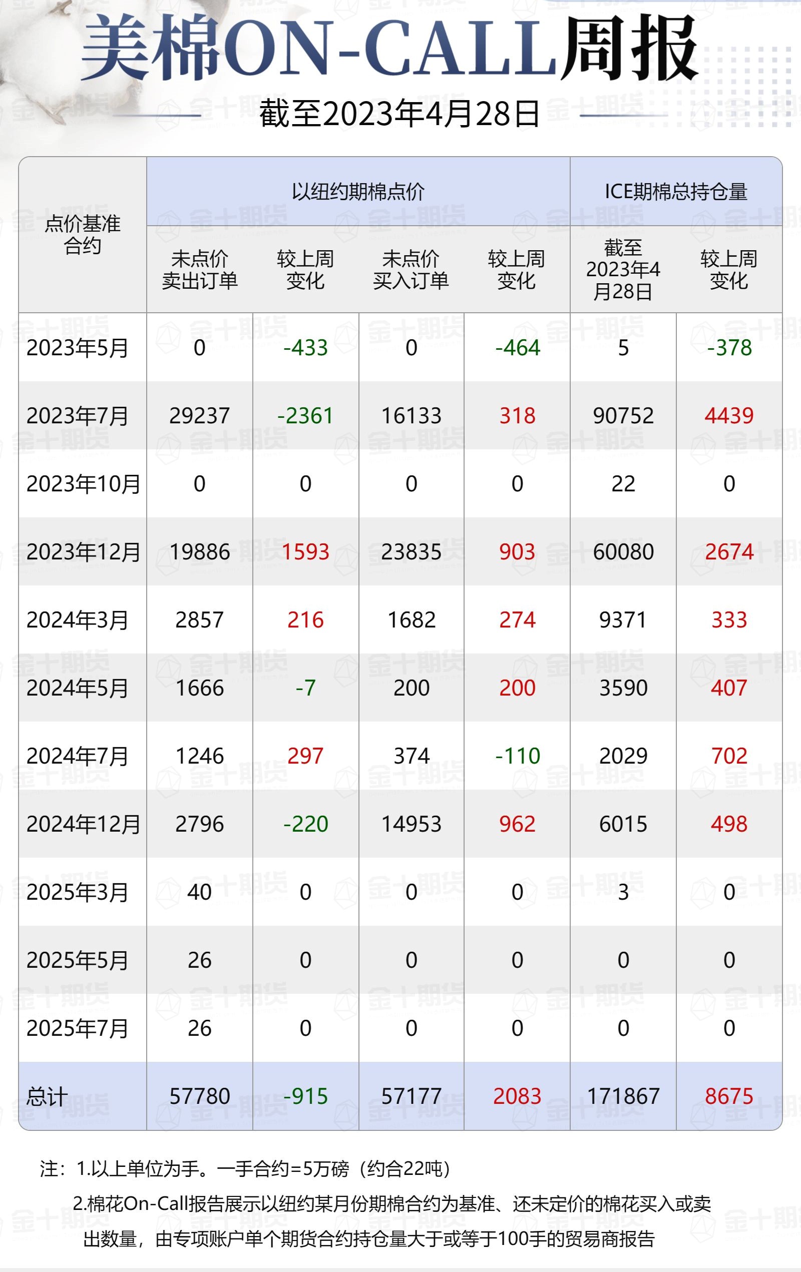據(jù)美國商品期貨交易委員會(huì)(CFTC)最新數(shù)據(jù),截至4月28日,①美棉On-Call未點(diǎn)價(jià)賣出訂單57780手,環(huán)比減少915手;未點(diǎn)價(jià)買入訂單57177手,環(huán)比增加2083手;②ICE期棉2305合約上賣方未點(diǎn)價(jià)合約為0手,較此前一周減少433手;③ICE期棉2307合約上賣方未點(diǎn)價(jià)合約為29237手,較此前一周減少2361手;④ICE棉花期貨盤面2022/23年度(8月至次年7月)的On-Call合約未點(diǎn)價(jià)賣出訂單為29237手,環(huán)比減少2794手。