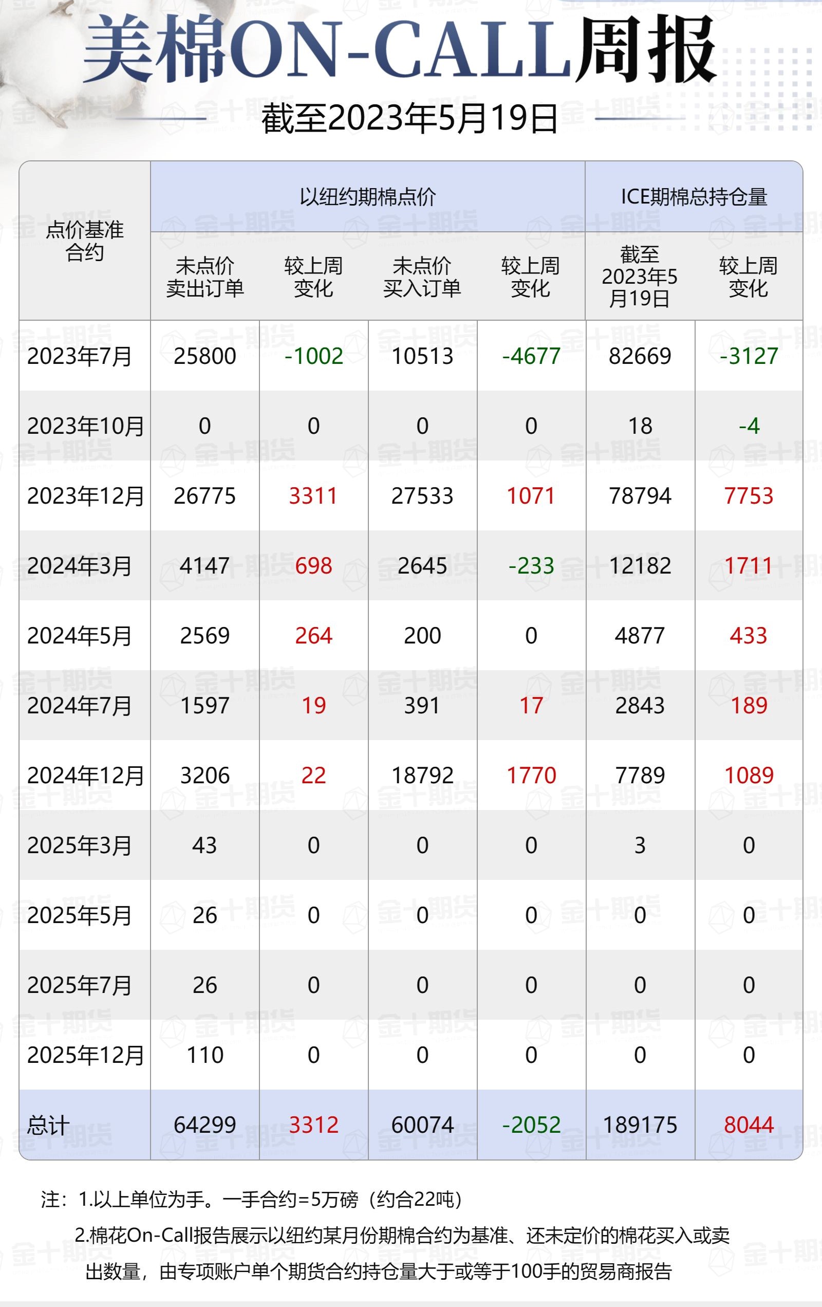 據(jù)美國商品期貨交易委員會(CFTC)最新數(shù)據(jù),截至5月19日,①美棉On-Call未點(diǎn)價(jià)賣出訂單64299手,環(huán)比增加3312手;未點(diǎn)價(jià)買入訂單60074手,環(huán)比減少2052手;②ICE期棉2307合約上賣方未點(diǎn)價(jià)合約為25800手,較此前一周減少1002手;③ICE棉花期貨盤面2022/23年度(8月至次年7月)的On-Call合約未點(diǎn)價(jià)賣出訂單為25800手,環(huán)比減少1002手。