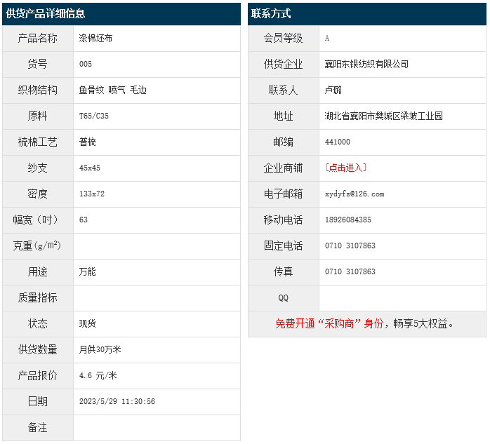 5月29日,襄陽東銀紡織有限公司滌棉魚骨紋T65/C35 45x45 133x72 63" 噴氣 毛邊,報價為4.6元/米,實際成交價以協(xié)商為準。[點擊查看詳情]