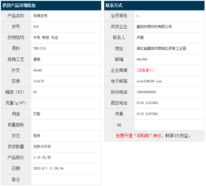 6月1日,襄陽東銀紡織有限公司滌棉平布T90/C10 45x45 110x76 63" 有梭 光邊,報(bào)價(jià)為3.35元/米,實(shí)際成交價(jià)以協(xié)商為準(zhǔn)。[點(diǎn)擊查看詳情]