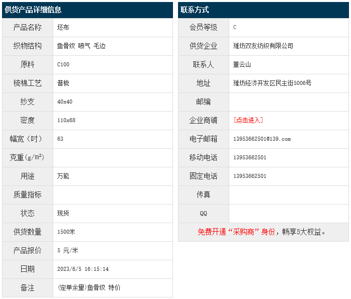 6月5日,濰坊雙友紡織有限公司純棉魚骨紋C100 40x40 110x68 63" 噴氣 毛邊,報價為5元/米,實際成交價以協(xié)商為準。[點擊查看詳情]