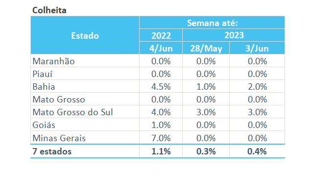 據(jù)巴西農(nóng)業(yè)部下屬的國家商品供應(yīng)公司CONAB,截至06月03日,巴西棉花收割率為0.4%,上周為0.3%,去年同期為1.1%。