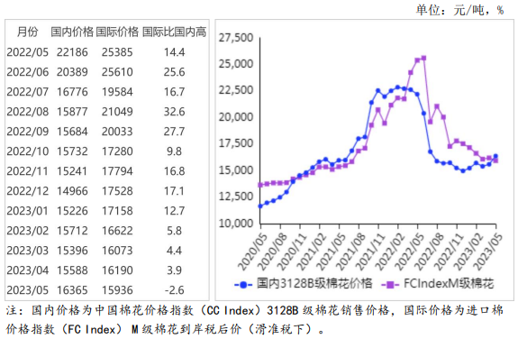 (二)國際棉價繼續(xù)下跌。本月,美債上限談判達成協(xié)議將有助于緩解當前全球市場的避險情緒,美聯(lián)儲為克服通脹將繼續(xù)加息的概率增加;疊加美國農(nóng)業(yè)部(USDA)美棉簽約裝運數(shù)據(jù)表現(xiàn)轉(zhuǎn)差等因素影響,國際棉價繼續(xù)下跌。5月,CotlookA指數(shù)(相當于國內(nèi)3128B級棉花)月均價每磅93.85美分,環(huán)比跌1.4%,同比跌43.0%。