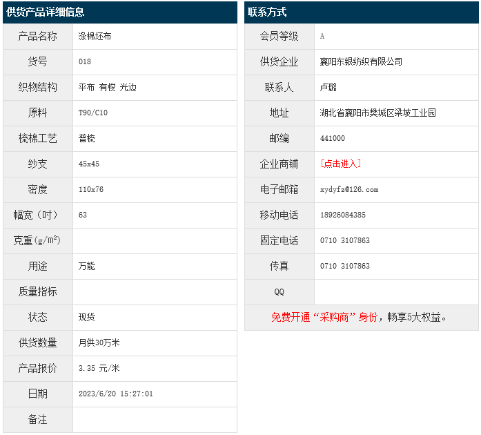 6月20日,襄陽東銀紡織有限公司滌棉平布T90/C10 45x45 110x76 63" 有梭 光邊,報(bào)價(jià)為3.35元/米,實(shí)際成交價(jià)以協(xié)商為準(zhǔn)。[點(diǎn)擊查看詳情]