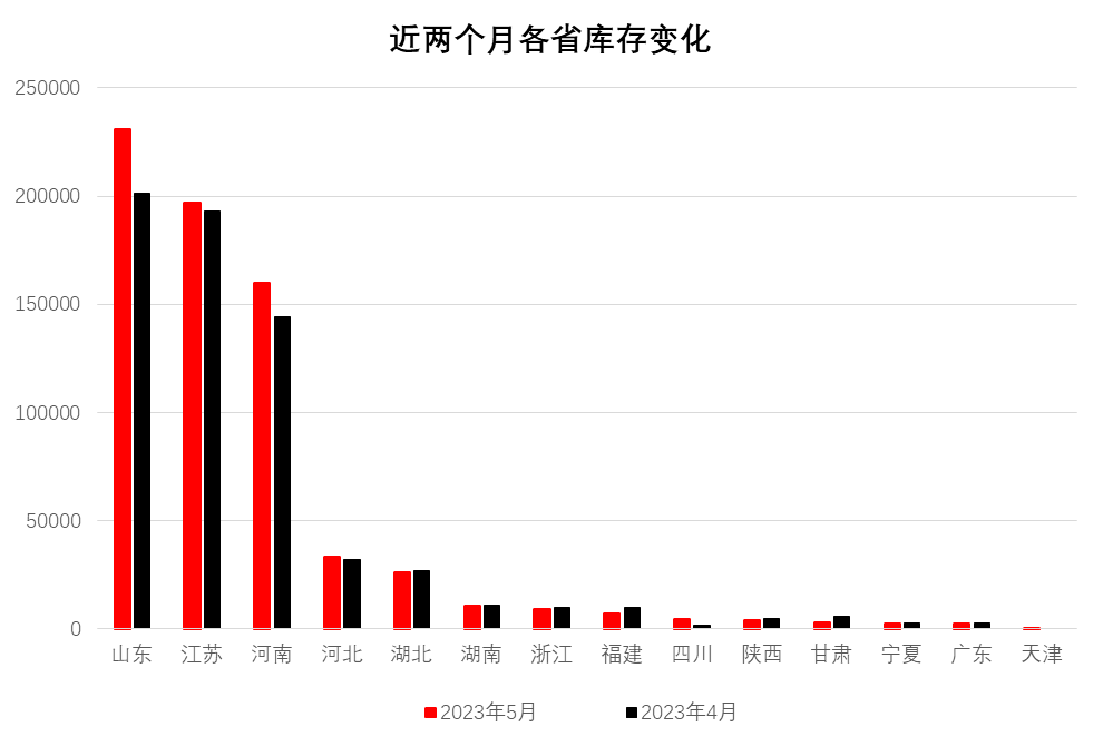 分省份看,山東省庫存量居首位23.11萬噸,環(huán)比增加2.98萬噸;江蘇省次之19.70萬噸,環(huán)比增加0.37萬噸;河南省居第三位15.99萬噸,環(huán)比增加1.55萬噸;其他省均在5萬噸以下,增減不一。