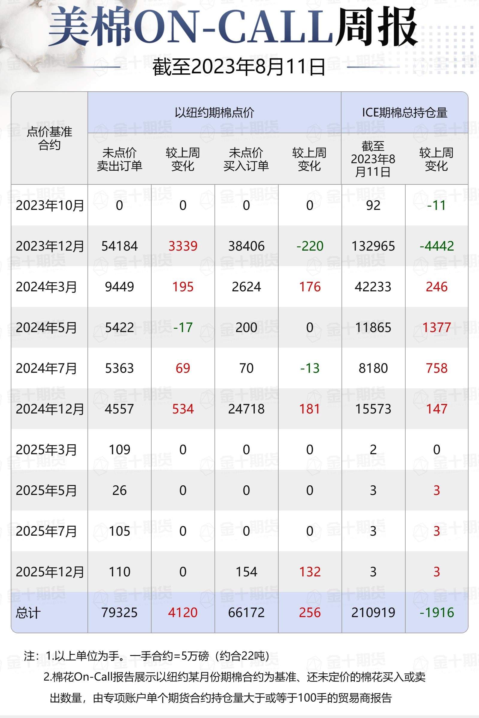 據(jù)美國商品期貨交易委員會(CFTC)最新數(shù)據(jù),截至8月11日,①美棉On-Call未點價賣出訂單79325手,環(huán)比增加4120手;未點價買入訂單66172手,環(huán)比增加256手;②ICE期棉2310合約上賣方未點價合約為0手,較此前一周增加0手;③ICE期棉2312合約上賣方未點價合約為54184手,較此前一周增加3339手;④ICE期棉2403合約上賣方未點價合約為9449手,較此前一周增加195手;⑤ICE期棉2405合約上賣方未點價合約為5422手,較此前一周減少17手;⑥ICE期棉2407合約上賣方未點價合約為5363手,較此前一周增加69手;⑦ICE棉花期貨盤面2023/24年度(8月至次年7月)的On-Call合約未點價賣出訂單為74418手,環(huán)比增加3586手。
