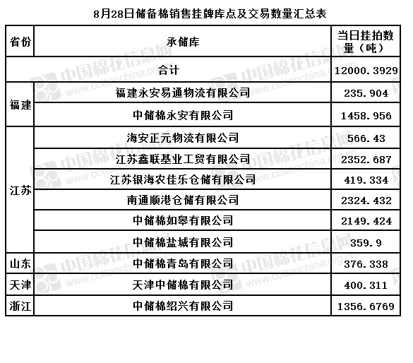 中國儲備棉管理有限公司定于8月28日通過全國棉花交易市場上市銷售儲備棉重量12000.3929噸,共37捆。具體庫點及數(shù)量見下表。