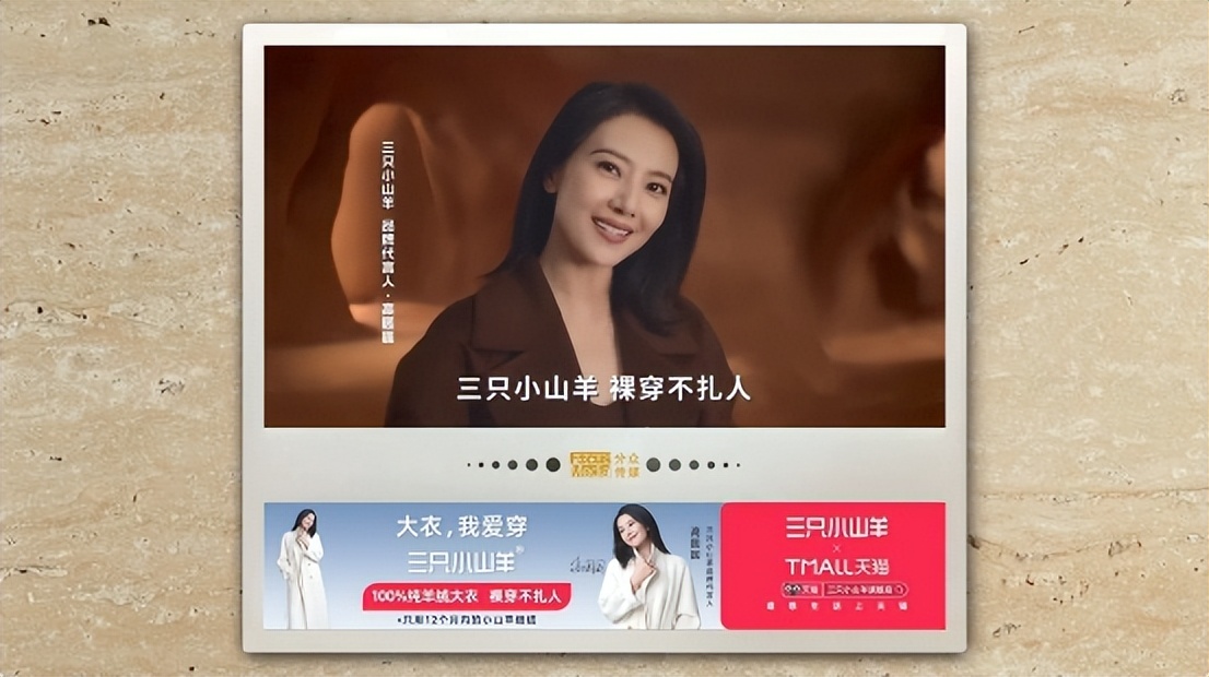 主流消費(fèi)人群在服裝市場(chǎng)起到了不可或缺的推動(dòng)作用,他們不僅對(duì)品質(zhì)有著超高的要求,且在審美和品牌選擇上也相當(dāng)挑剔。面對(duì)這樣的高標(biāo)準(zhǔn),三只小山羊通過(guò)與高圓圓的合作,成功傳達(dá)其高品質(zhì)和高級(jí)美的品牌理念。為與主流消費(fèi)人群深度互動(dòng),三只小山羊聯(lián)合分眾,讓三只小山羊產(chǎn)品及品牌理念觸達(dá)更多主流消費(fèi)者。