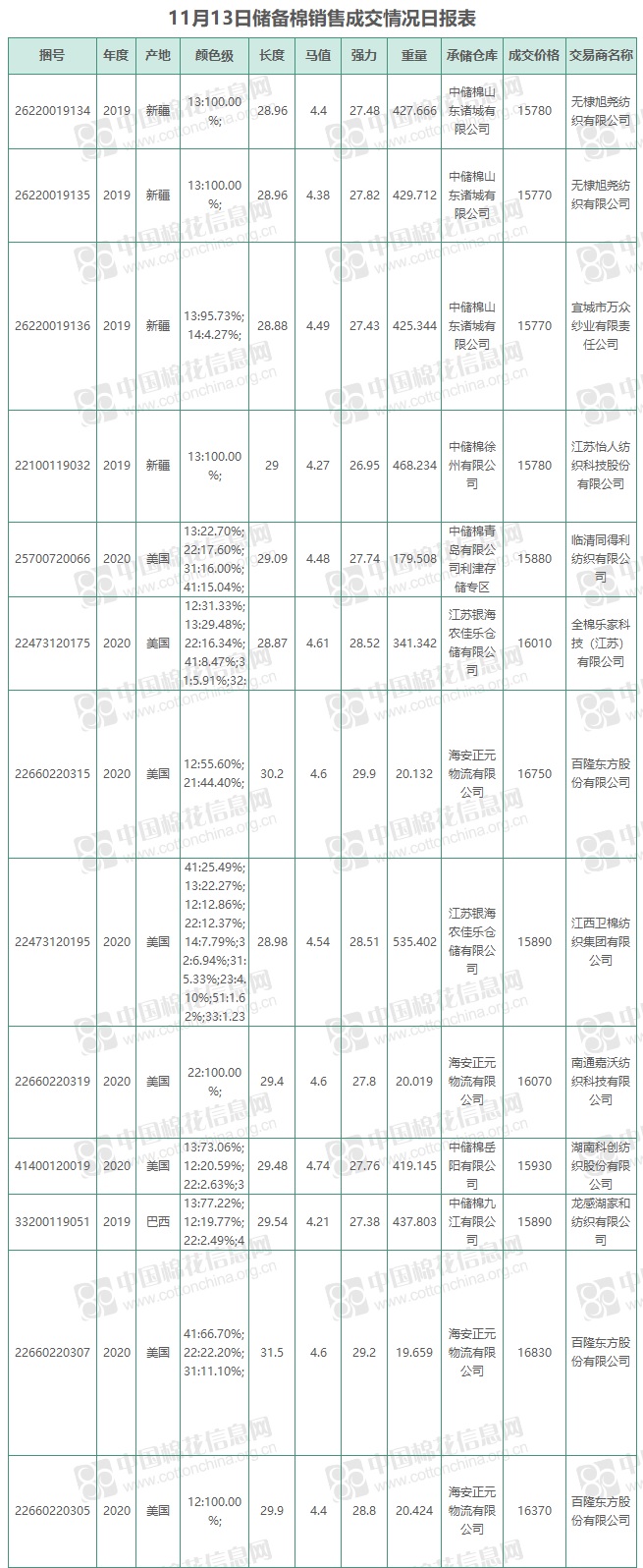 11月13日儲(chǔ)備棉銷售資源12003.9329噸,實(shí)際成交3744.39噸,成交率31.19%,成交均價(jià)15864元/噸,較前一日-297元/噸,折3128價(jià)格16323元/噸,較前一日-381元/噸。