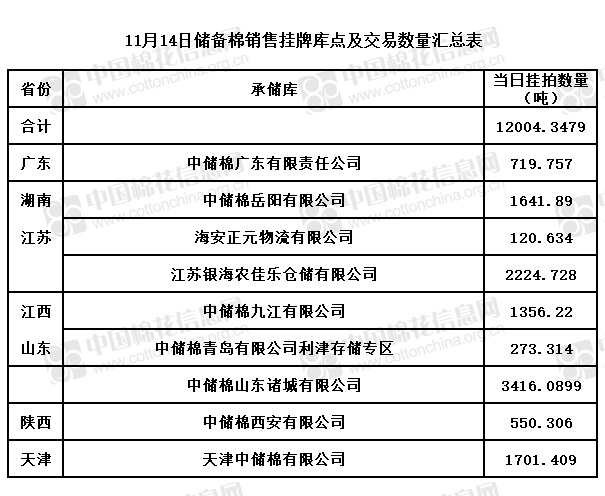 中國儲備棉管理有限公司定于11月14日通過全國棉花交易市場上市銷售儲備棉重量12004.3479噸,共36捆。具體庫點及數(shù)量見下表。