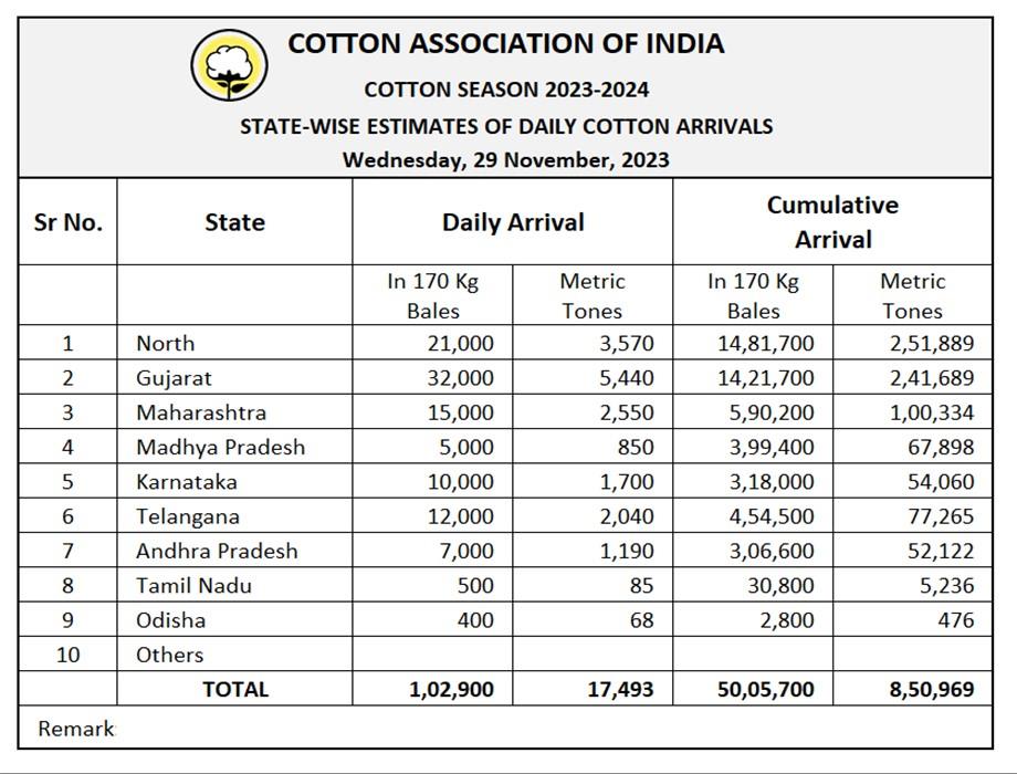 2023/24年度(10月至次年9月)迄今,印度棉花到貨量為5005700包或850969噸。