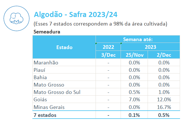 據(jù)巴西農(nóng)業(yè)部下屬的國家商品供應(yīng)公司CONAB,截至12月2日,巴西棉花播種率為0.5%,上周為0.1%。
