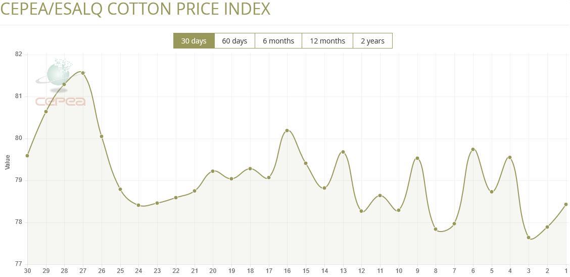 據(jù)外電12月13日消息,12月13日巴西CEPEA/ESALQ棉花價(jià)格指數(shù)報(bào)每磅78.43美分,較前一日上漲0.69%。