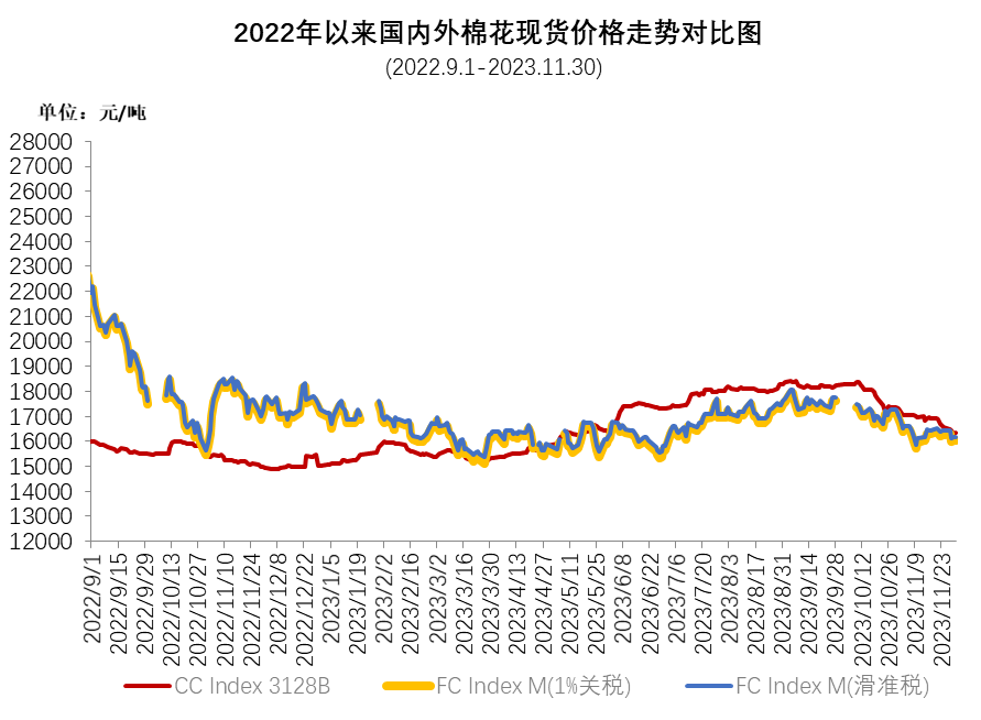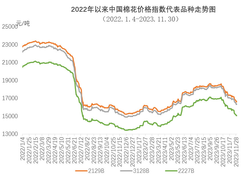 11月,新棉大量上市,棉市供應(yīng)寬松。月內(nèi),紡織市場處傳統(tǒng)消費淡季,下游新增訂單不足,成品庫存持續(xù)增加,企業(yè)以降價去庫存為主,同時下調(diào)開機率,以緩解庫存及資金壓力,對皮棉原料謹慎采購。國內(nèi)現(xiàn)貨價格持續(xù)下跌,最低跌至16314元/噸,棉企銷售壓力不斷增加。國際市場,受美聯(lián)儲加息預(yù)期增強及下游需求不佳等因素影響,國際棉價重心明顯下移。