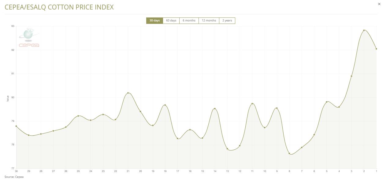 據(jù)外電12月20日消息,12月20日巴西CEPEA/ESALQ棉花價(jià)格指數(shù)報(bào)每磅82.05美分,較前一日下滑0.94%。