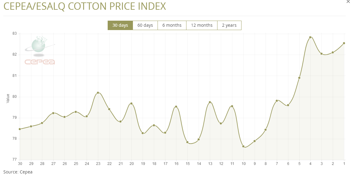 據(jù)外電12月22日消息,12月22日巴西CEPEA/ESALQ棉花價(jià)格指數(shù)報(bào)每磅82.55美分,較前一日上漲0.54%。