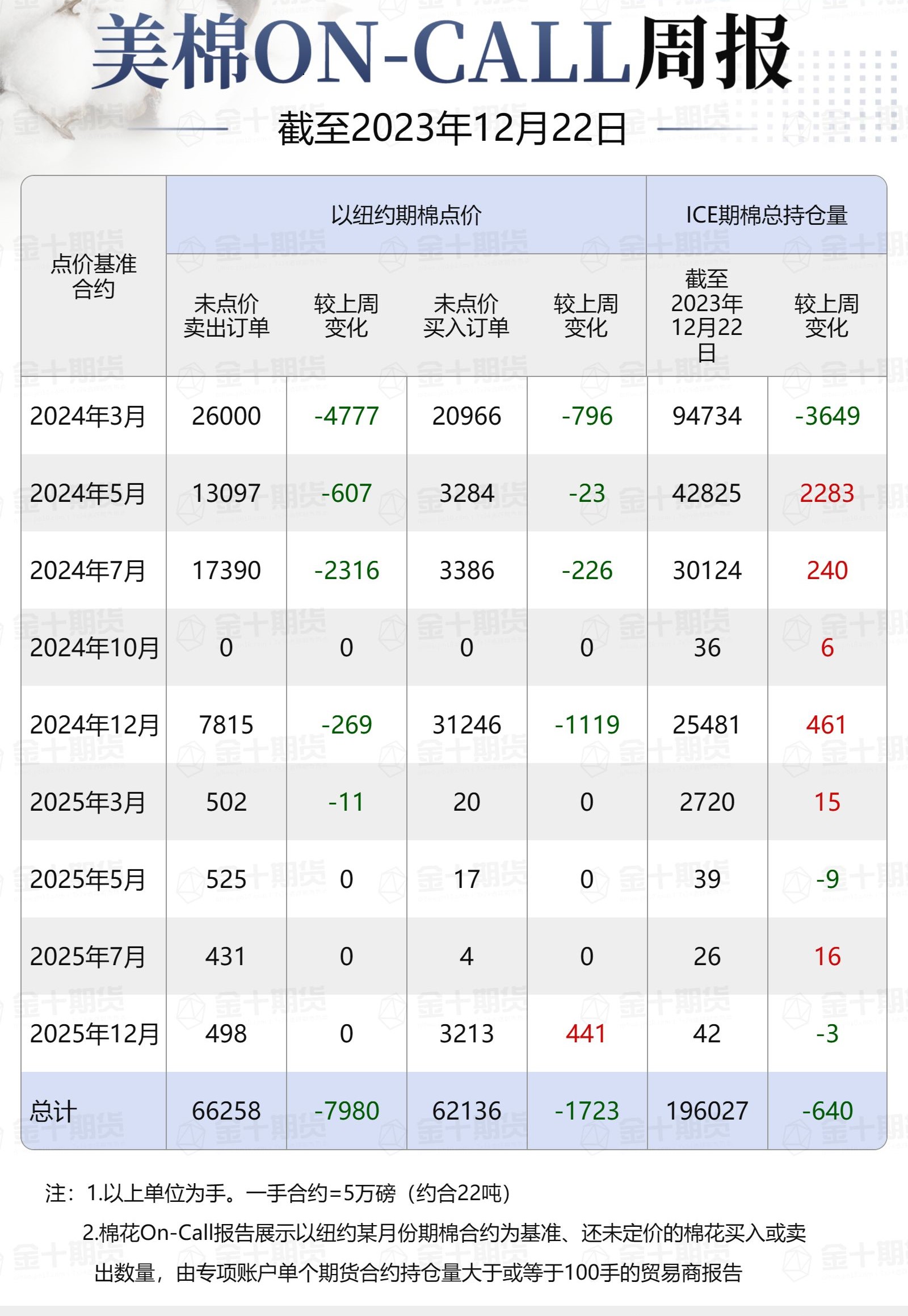 據(jù)美國(guó)商品期貨交易委員會(huì)(CFTC)最新數(shù)據(jù),截至12月22日,①美棉On-Call未點(diǎn)價(jià)賣出訂單66258手,環(huán)比減少7980手;未點(diǎn)價(jià)買入訂單62136手,環(huán)比減少1723手;②ICE期棉2403合約上賣方未點(diǎn)價(jià)合約為26000手,較此前一周減少4777手;③ICE期棉2405合約上賣方未點(diǎn)價(jià)合約為13097手,較此前一周減少607手;④ICE期棉2407合約上賣方未點(diǎn)價(jià)合約為17390手,較此前一周減少2316手;⑤ICE棉花期貨盤面2023/24年度(8月至次年7月)的On-Call合約未點(diǎn)價(jià)賣出訂單為56487手,環(huán)比減少7700手。