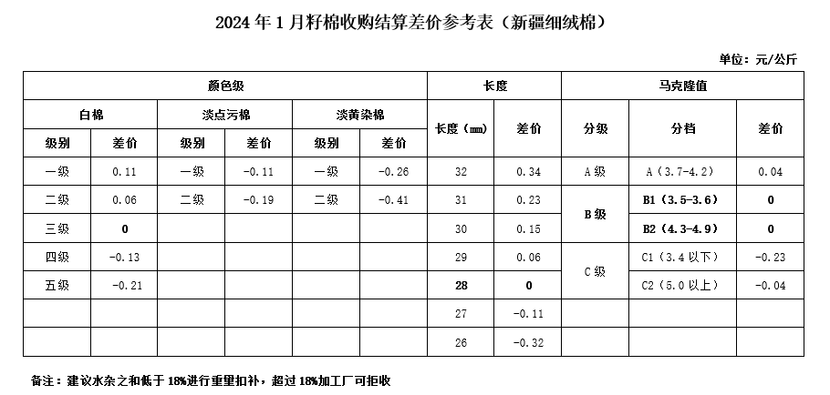 依據(jù)中國棉花協(xié)會發(fā)布的2024年1月《鋸齒加工細絨棉質(zhì)量差價表》和中國棉花預(yù)警系統(tǒng)2023年9-12月新疆籽棉收購平均衣分率數(shù)據(jù),折算得出籽棉收購差價,現(xiàn)正式發(fā)布2024年1月《籽棉收購結(jié)算差價參考表(新疆細絨棉)》(單位:元/公斤),為新疆地區(qū)籽棉收購工作提供參考。