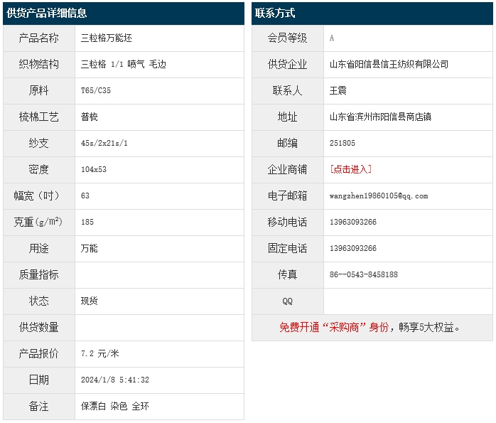 1月7日,山東陽信縣信王紡織有限公司滌棉三粒格T65/C35 45/2x21 104x53 63" 1/1 185g/㎡ 噴氣 毛邊,報價為7.2元/米,實際成交價以協(xié)商為準(zhǔn)。[點擊查看詳情]
