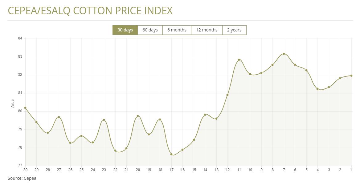 據(jù)外電1月5日消息,1月5日巴西CEPEA/ESALQ棉花價(jià)格指數(shù)報(bào)每磅81.96美分,較前一日上漲0.17%。