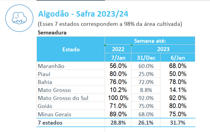 據(jù)巴西農(nóng)業(yè)部下屬的國家商品供應(yīng)公司CONAB,截至1月6日,巴西棉花播種率為31.7%,上周為26.1%,去年同期為28.8%。
