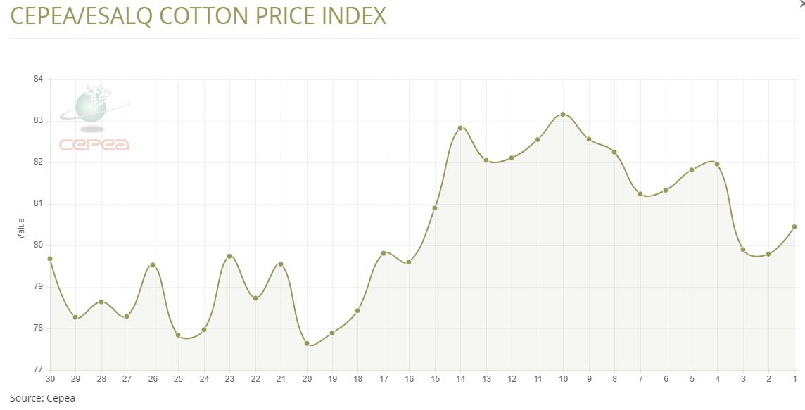據(jù)外電1月10日消息,1月10日巴西CEPEA/ESALQ棉花價(jià)格指數(shù)報(bào)每磅80.45美分,較前一日上漲0.83%%。
