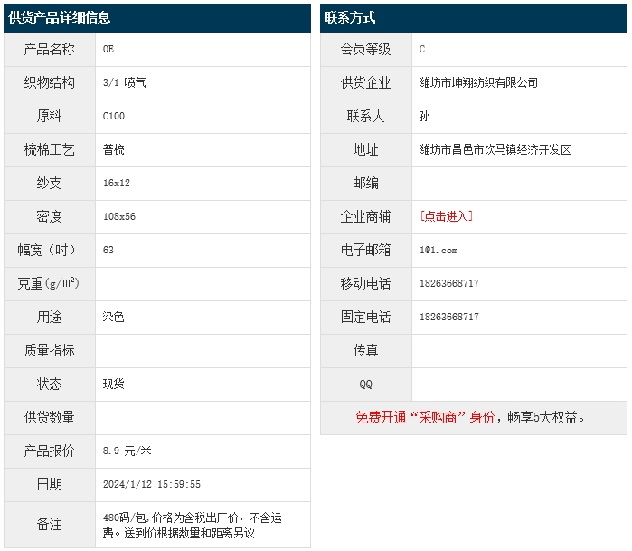 1月12日,濰坊坤翔紡織有限公司純棉布OEC100 16x12 108x56 63" 3/1 噴氣,報價為8.9元/米,實際成交價以協(xié)商為準(zhǔn)。[點擊查看詳情]