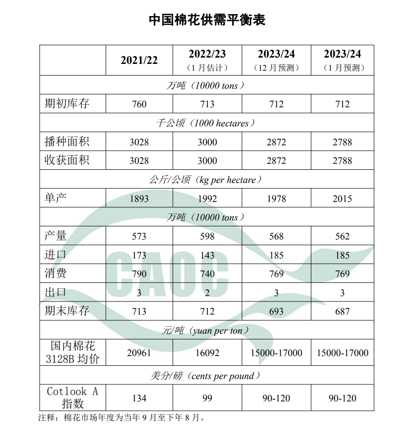 據(jù)國家統(tǒng)計局公告,2023年中國棉花播種面積2788.1千公頃,比上年降7.1%;單產(chǎn)每公頃2014.9公斤,比上年增1.1%;總產(chǎn)量561.8萬噸,比上年降6.1%。2023/24年度棉花生產(chǎn)預測數(shù)據(jù)據(jù)此調(diào)整。新年度皮棉加工收尾,銷售進度略慢,據(jù)國家棉花市場監(jiān)測系統(tǒng)數(shù)據(jù),截至1月4日,全國皮棉加工率和銷售率分別94.8%和19.8%,比上年同期分別上升17.0個百分點和下降0.1個百分點。春節(jié)前剛需補庫,預計需求階段性轉(zhuǎn)好。
