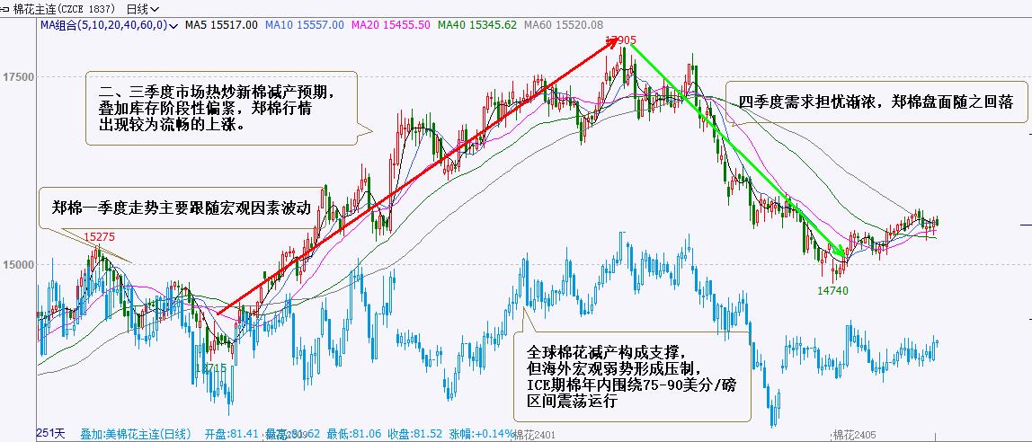 回顧2023年,國(guó)內(nèi)與國(guó)際棉市關(guān)聯(lián)性一般,鄭棉波動(dòng)整體大于ICE期棉。國(guó)際市場(chǎng)上,基于糧棉比價(jià)情況及厄爾尼諾氣候,全球棉花減產(chǎn)構(gòu)成支撐,但海外宏觀弱勢(shì)形成壓制,ICE期棉年內(nèi)圍繞75-90美分/磅區(qū)間震蕩運(yùn)行,最終錄得近3%年跌幅。國(guó)內(nèi)方面,鄭棉1季度走勢(shì)主要跟隨宏觀因素波動(dòng),2、3季度市場(chǎng)熱炒新棉減產(chǎn)預(yù)期,疊加庫(kù)存階段性偏緊,行情出現(xiàn)較為流暢的上漲,4季度需求擔(dān)憂漸濃,盤面隨之回落,鄭棉一波三折走勢(shì)之下,年線上漲逾8%。新的一年,市場(chǎng)將迎來哪些變化,國(guó)內(nèi)外棉價(jià)又將如何演繹?