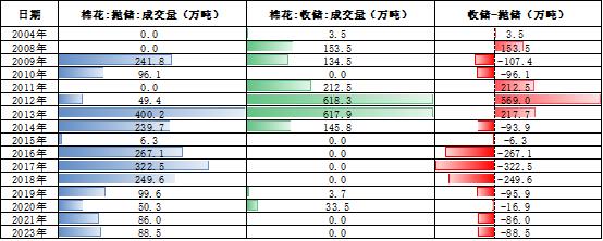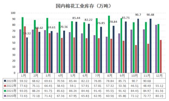 2023年,為緩解市場(chǎng)階段性供應(yīng)緊張問題,7月末國(guó)家儲(chǔ)備棉銷售開始。2023年中央儲(chǔ)備棉銷售工作自7月31日開啟,于2023年11月14日結(jié)束,共75個(gè)交易日,累計(jì)上市掛拍1232138.1425噸,累計(jì)成交884744.8611噸,累計(jì)成交率71.81%。在2023年拋儲(chǔ)之后,市場(chǎng)預(yù)計(jì)國(guó)儲(chǔ)庫(kù)國(guó)產(chǎn)棉及進(jìn)口棉合計(jì)庫(kù)存數(shù)量大約在100-250萬噸區(qū)間。在國(guó)儲(chǔ)庫(kù)存水平處低位背景下,2024年大概率會(huì)進(jìn)行收儲(chǔ)。拋儲(chǔ)方面,需關(guān)注新棉播種之后是否會(huì)有天氣炒作導(dǎo)致產(chǎn)業(yè)矛盾加劇,如果行情重演,儲(chǔ)備棉輪出則可能會(huì)開展。輪儲(chǔ)政策作為棉價(jià)調(diào)控的有力抓手,其開展的可能性還需視市場(chǎng)價(jià)格波動(dòng)情況而定。