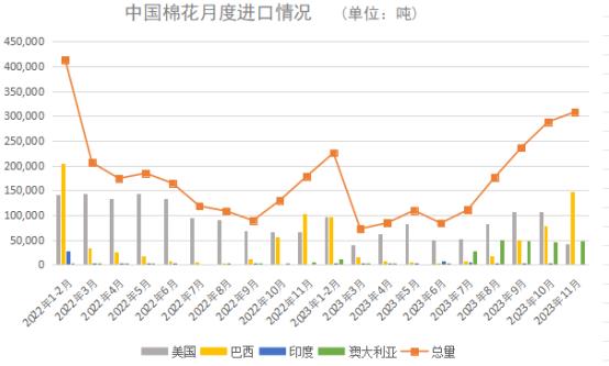 國(guó)內(nèi)棉花進(jìn)口實(shí)行固定配額與滑準(zhǔn)稅配額并行的“雙關(guān)稅”制度。2018年開始,我國(guó)在棉花固定配額基礎(chǔ)上增發(fā)滑準(zhǔn)稅配額。2023年滑準(zhǔn)稅配額數(shù)量75萬噸,增發(fā)背景是當(dāng)時(shí)現(xiàn)貨資源出現(xiàn)階段性供應(yīng)緊張,政策層面決心維穩(wěn)棉花價(jià)格。2024年,在產(chǎn)量不出現(xiàn)大幅下滑情況下,滑準(zhǔn)稅配額可能較去年有所回落。進(jìn)口量方面,2023年上半年進(jìn)口利潤(rùn)倒掛,下半年開始進(jìn)口利潤(rùn)回正,3、4季度進(jìn)口環(huán)比明顯增加,但年底進(jìn)口利潤(rùn)再次收窄。據(jù)海關(guān)統(tǒng)計(jì)數(shù)據(jù),2023年1-11月我國(guó)進(jìn)口棉花169萬噸,同比減少約4%。展望今年,外棉受到宏觀環(huán)境的壓制仍將高于國(guó)內(nèi),外棉價(jià)格弱于國(guó)內(nèi)棉價(jià)的可能性較大,且還考慮到國(guó)儲(chǔ)補(bǔ)庫(kù)需求,預(yù)計(jì)2024年棉花進(jìn)口量或有所提高。