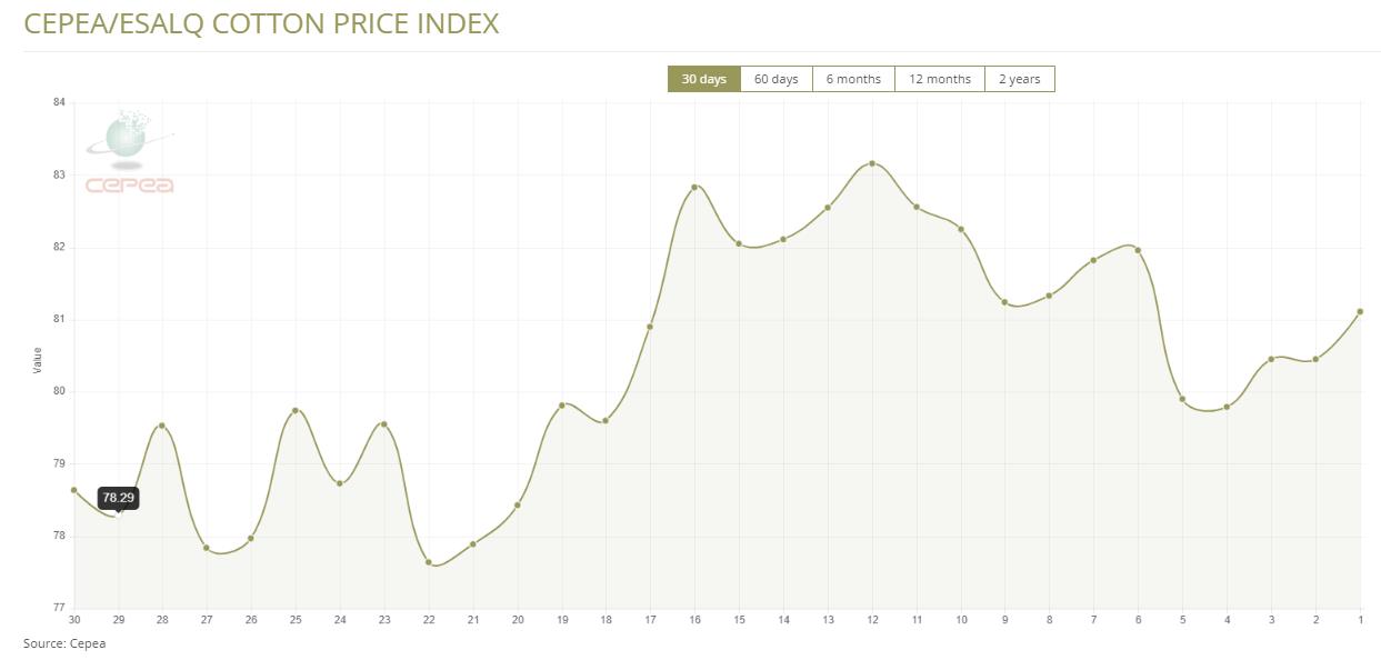 據(jù)外電1月12日消息,1月12日巴西CEPEA/ESALQ棉花價(jià)格指數(shù)報(bào)每磅81.11美分,較前一日上漲0.82%。