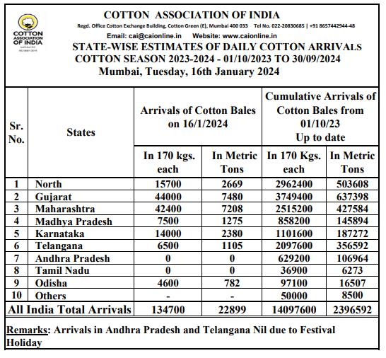 據外電1月16日消息,印度棉花協(xié)會(CAI)公布,1月16日印度棉花到貨量估計為134700包(每包170公斤)或22899噸。