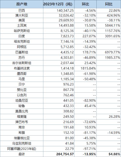 據(jù)海關(guān)統(tǒng)計數(shù)據(jù),2023年12月我國進口棉花約26萬噸,環(huán)比減少約5萬噸,同比增長約54.9%。