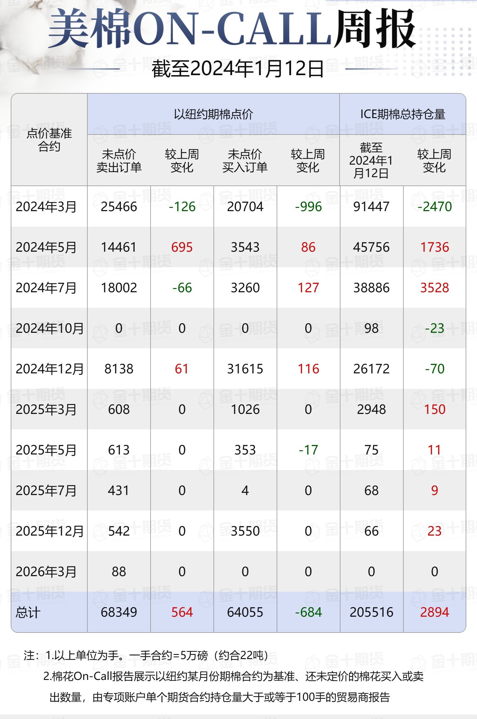 據(jù)美國商品期貨交易委員會(CFTC)最新數(shù)據(jù),截至1月12日,①美棉On-Call未點價賣出訂單68349手,環(huán)比增加564手;未點價買入訂單64055手,環(huán)比減少684手;②ICE期棉2403合約上賣方未點價合約為25466手,較此前一周減少126手;③ICE期棉2405合約上賣方未點價合約為14461手,較此前一周增加695手;④ICE期棉2407合約上賣方未點價合約為18002手,較此前一周減少66手;⑤ICE棉花期貨盤面2023/24年度(8月至次年7月)的On-Call合約未點價賣出訂單為57929手,環(huán)比增加503手。