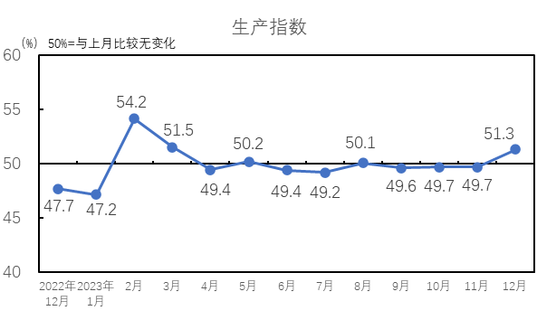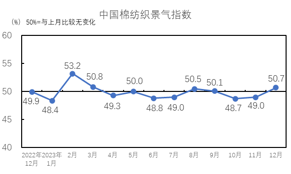 2023年12月,中國棉紡織景氣指數(shù)為50.7%,較11月上升1.7個百分點,景氣指數(shù)較上月有明顯改善。國家統(tǒng)計局發(fā)布的2023年12月中國制造業(yè)采購經(jīng)理指數(shù)為49.0%,環(huán)比下降0.4個百分點,制造業(yè)景氣水平有所回落。中國棉紡織景氣指數(shù)高于中國制造業(yè)采購經(jīng)理指數(shù)1.7個百分點,處回升階段。
