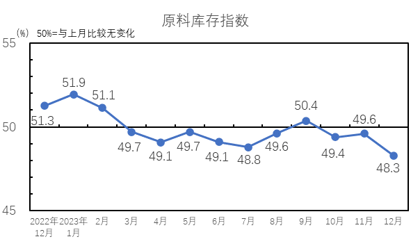 2023年12月,原料庫存指數(shù)為48.3%,較11月下降1.3個百分點,行業(yè)主要原材料庫存量下降。受年前補庫行情利好,市場出現(xiàn)回暖,但由于粘膠短纖價格持續(xù)下降,棉花、滌綸短纖價格大幅波動,企業(yè)原料采購謹(jǐn)慎,原料庫存環(huán)比下降。其中棉花庫存量指數(shù)為47.8%,較11月下降2.1個百分點;非棉纖維庫存量指數(shù)為48.8%,較11月下降0.4個百分點。