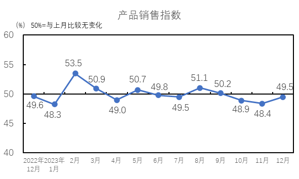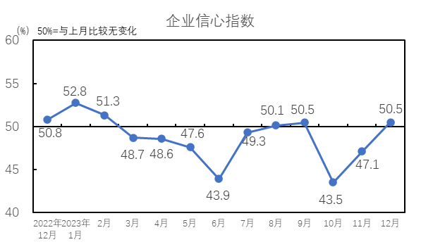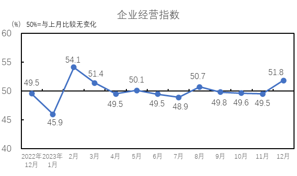 2023年12月,企業(yè)經(jīng)營指數(shù)為51.8%,較11月上升2.3個百分點,企業(yè)經(jīng)營壓力減輕。當(dāng)前年前補貨行情影響,市場需求回暖,企業(yè)訂單回升,產(chǎn)品銷售轉(zhuǎn)好,庫存壓力降低,但產(chǎn)品銷售價格仍不理想,企業(yè)利潤好轉(zhuǎn)程度不及經(jīng)營。從構(gòu)成企業(yè)經(jīng)營指數(shù)的分項指標(biāo)看,主營業(yè)務(wù)收入指數(shù)為52.9%,較11月上升3.5個百分點;利潤總額指數(shù)為50.7%,較11月上升1.2個百分點。