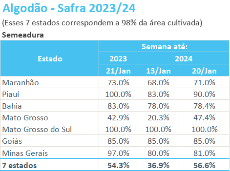 據(jù)巴西農(nóng)業(yè)部下屬的國家商品供應(yīng)公司CONAB,截至1月20日,巴西棉花播種率為56.6%,上周為36.9%,去年同期為54.3%。