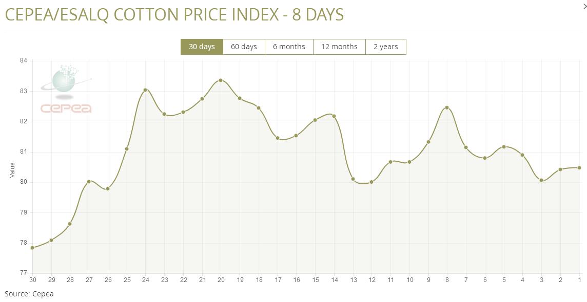 據(jù)外電1月24日消息,1月24日巴西CEPEA/ESALQ棉花價格指數(shù)報每磅80.48美分,較前一日上漲0.07%。