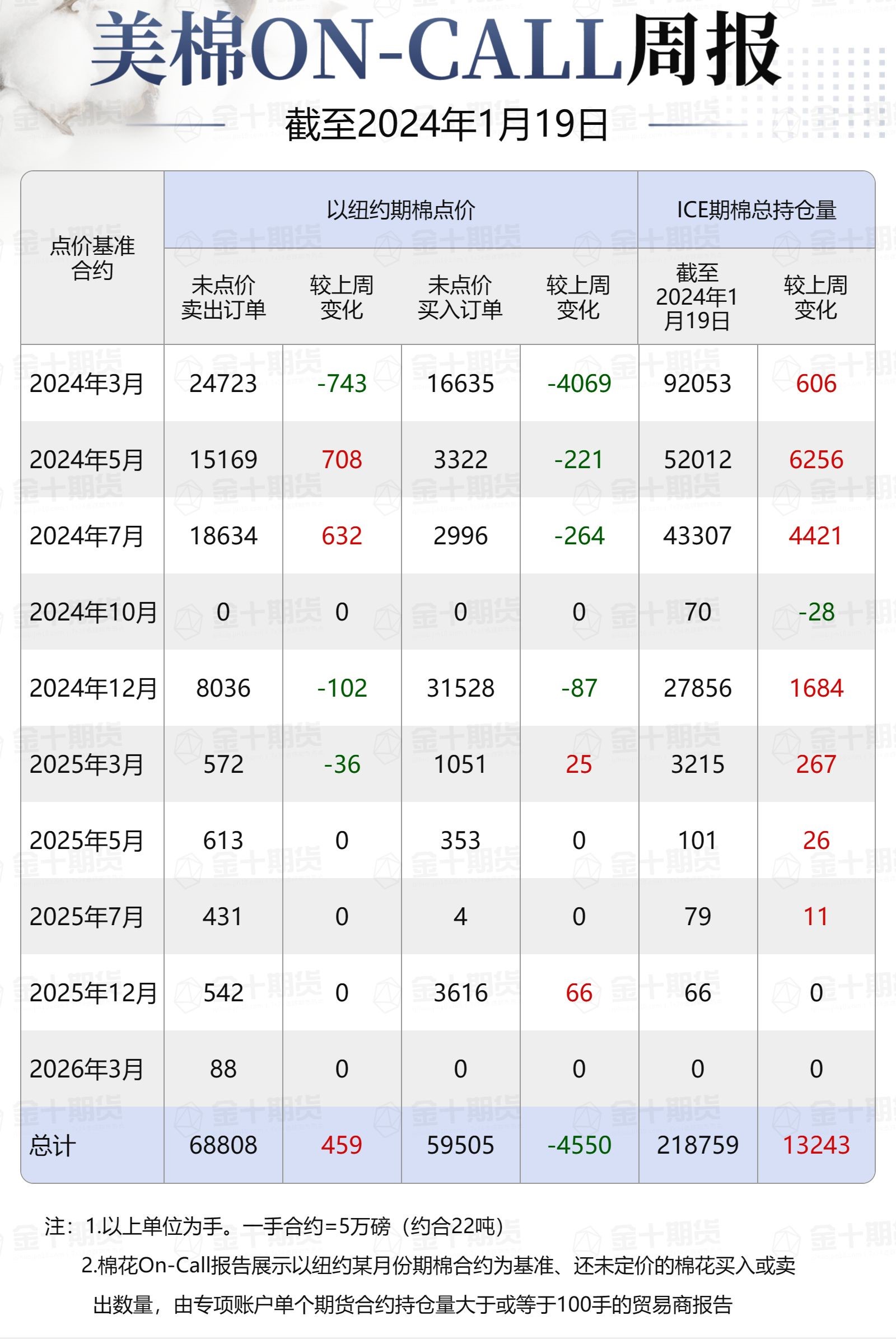 據(jù)美國商品期貨交易委員會(CFTC)最新數(shù)據(jù),截至1月19日,①美棉On-Call未點價賣出訂單68808手,環(huán)比增加459手;未點價買入訂單59505手,環(huán)比減少4550手;②ICE期棉2403合約上賣方未點價合約為24723手,較此前一周減少743手;③ICE期棉2405合約上賣方未點價合約為15169手,較此前一周增加708手;④ICE期棉2407合約上賣方未點價合約為18634手,較此前一周增加632手;⑤ICE棉花期貨盤面2023/24年度(8月至次年7月)的On-Call合約未點價賣出訂單為58526手,環(huán)比增加597手。