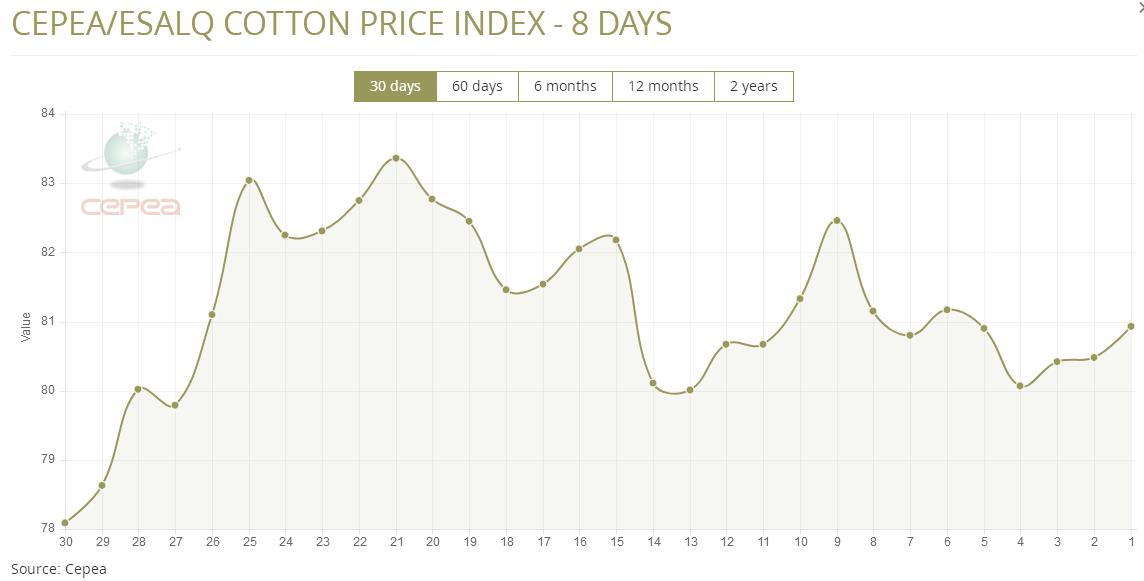 據(jù)外電1月25日消息,1月25日巴西CEPEA/ESALQ棉花價(jià)格指數(shù)報(bào)每磅80.93美分,較前一日上漲0.56%。