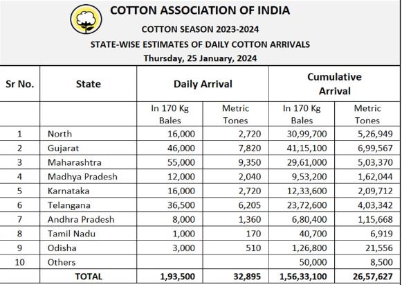 據(jù)外電1月25日消息,印度棉花協(xié)會(CAI)公布,1月25日印度棉花到貨量估計為193500包(每包170公斤),或32895噸。