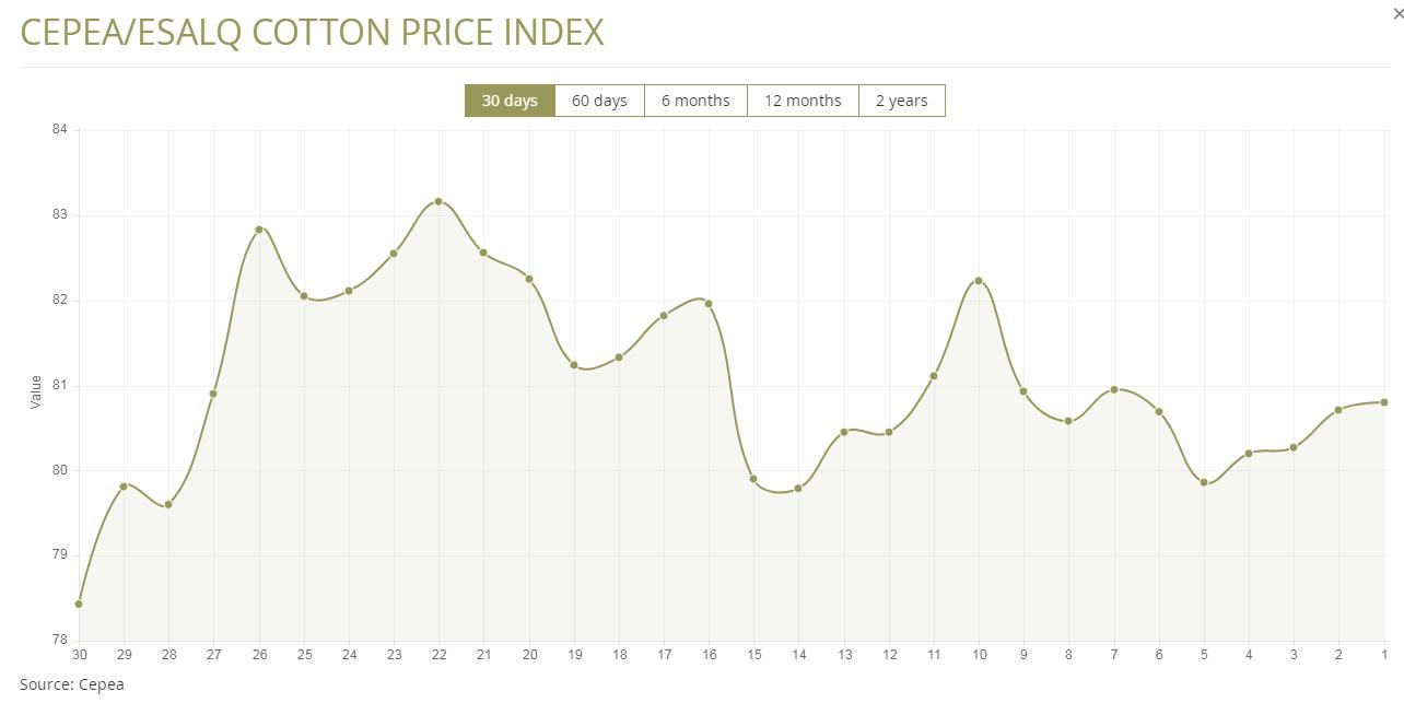 據外電1月26日消息,1月26日巴西CEPEA/ESALQ棉花價格指數報每磅80.80美分,較前一日上漲0.11%。