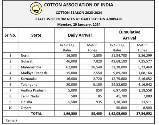 2023/24年度(10月至次年9月)迄今,印度棉花到貨量為16205600包或2754952噸。