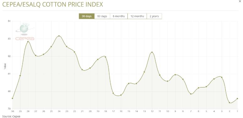 據(jù)外電1月30日消息,1月30日巴西CEPEA/ESALQ棉花價格指數(shù)報每磅79.59美分,較前一日上漲0.29%。
