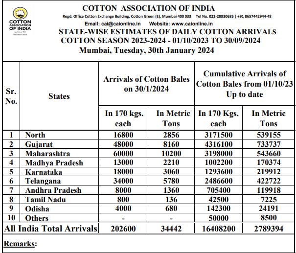 據(jù)外電1月30日消息,印度棉花協(xié)會(huì)(CAI)公布,1月30日印度棉花到貨量估計(jì)為202600包(每包170公斤)或34442噸。